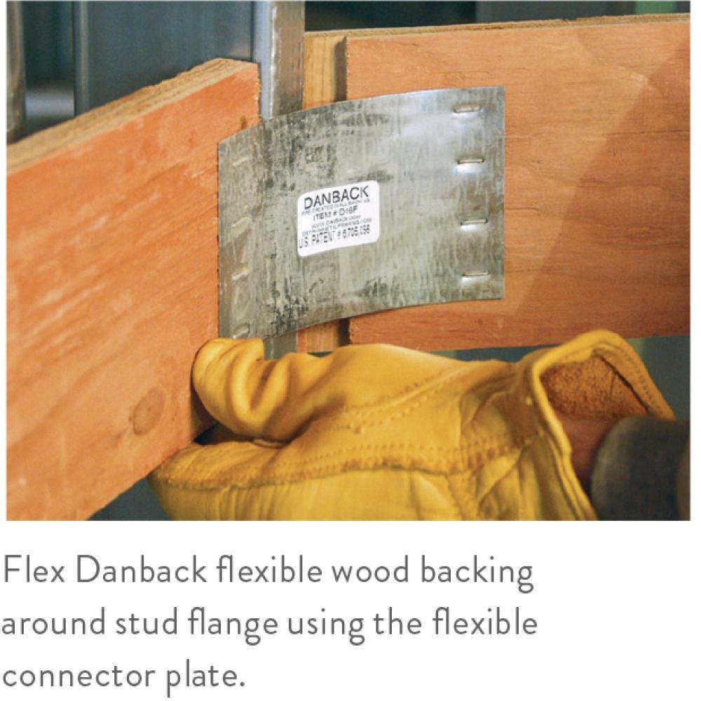 - Flex Danback flexible wood backing around stud flange using the flexible connector plate.