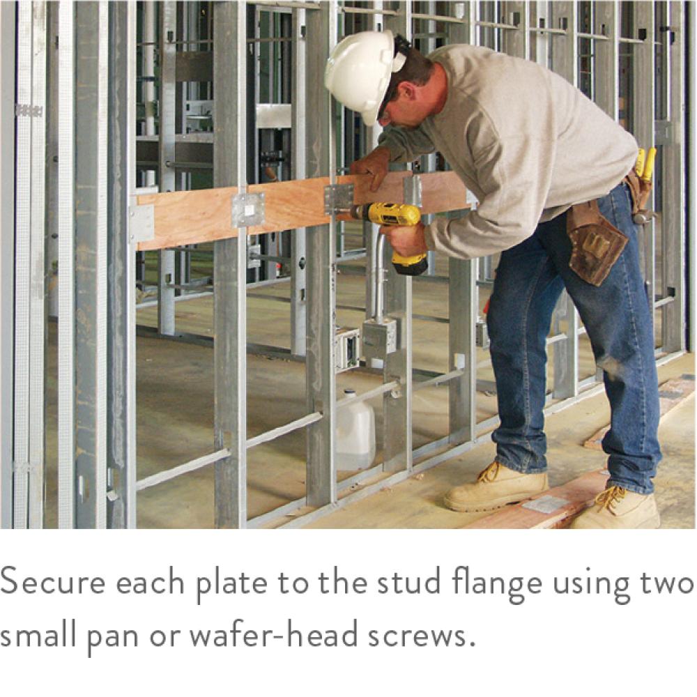 - Secure each plate to the stud flange using (3) #8 wafer head/pan head screws. Place one screw at the center and one screw 1/2" from top and bottom of the plate edge.