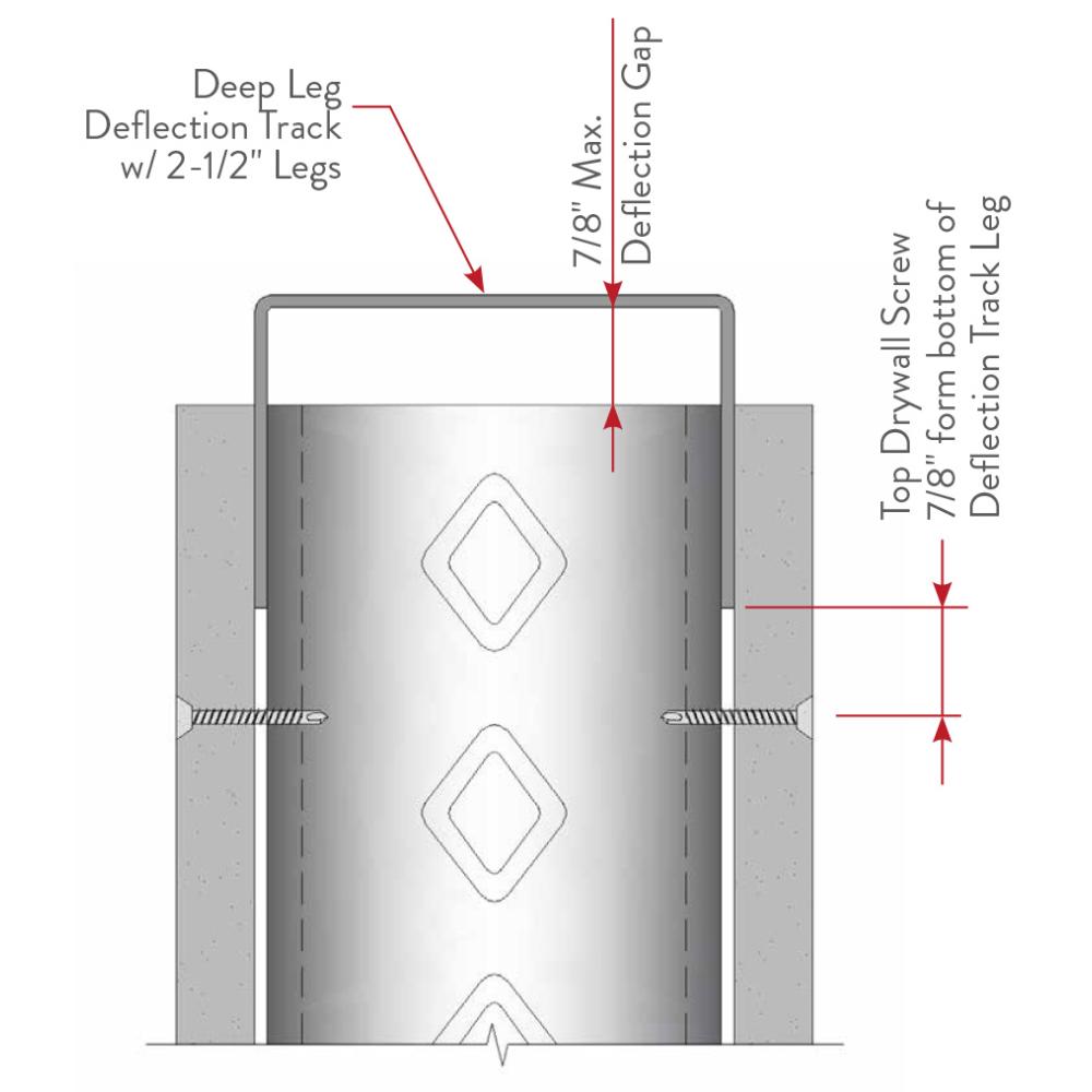 Head-of-wall vertical deep leg deflection track systems are required to allow the top of the wall stud to float within the top track legs. This connection allows for vertical live load movement of the primary structure without transferring axial loads to the interior drywall studs. A gap (determined by the Engineer of Record) is required between the top of the wall stud and the deflection track.