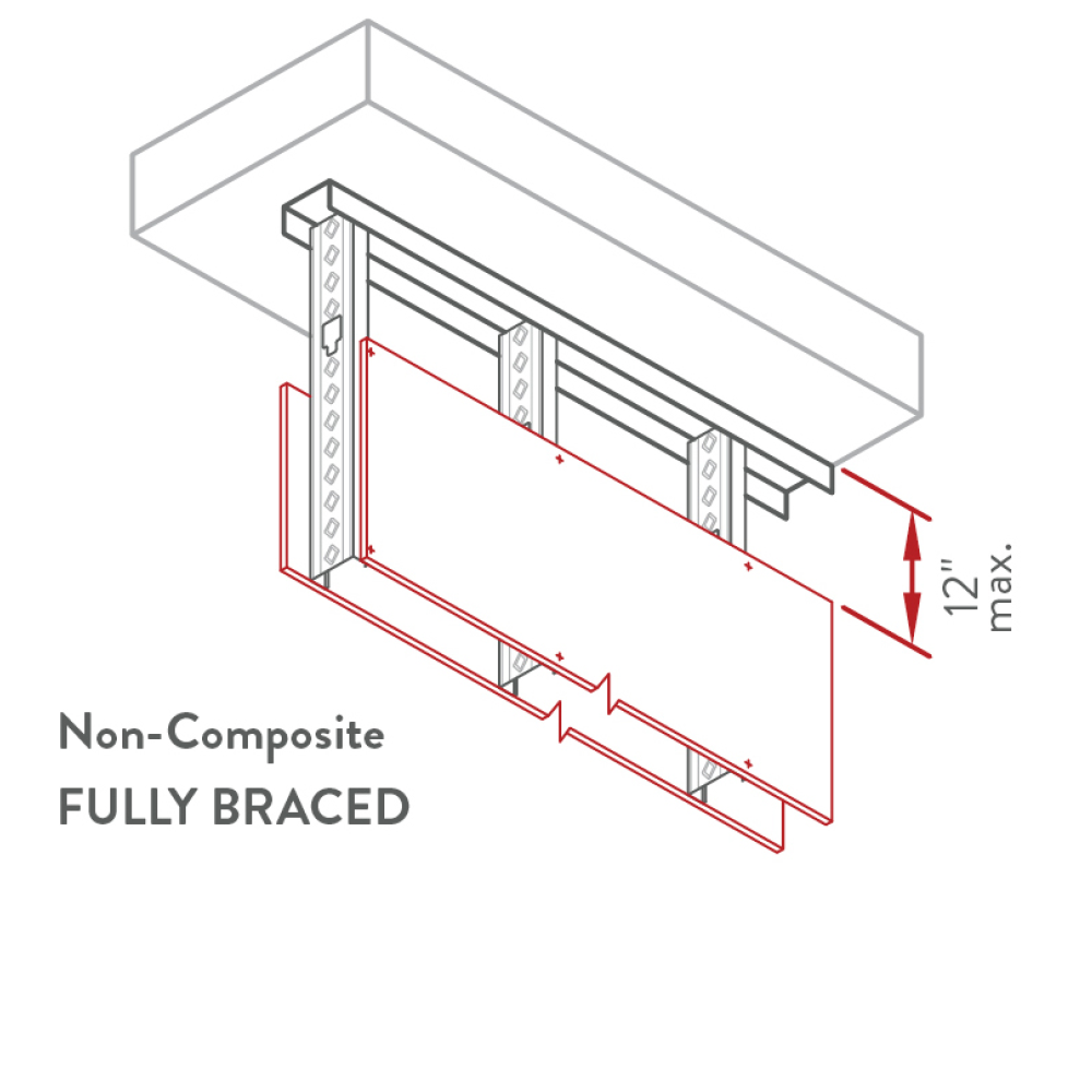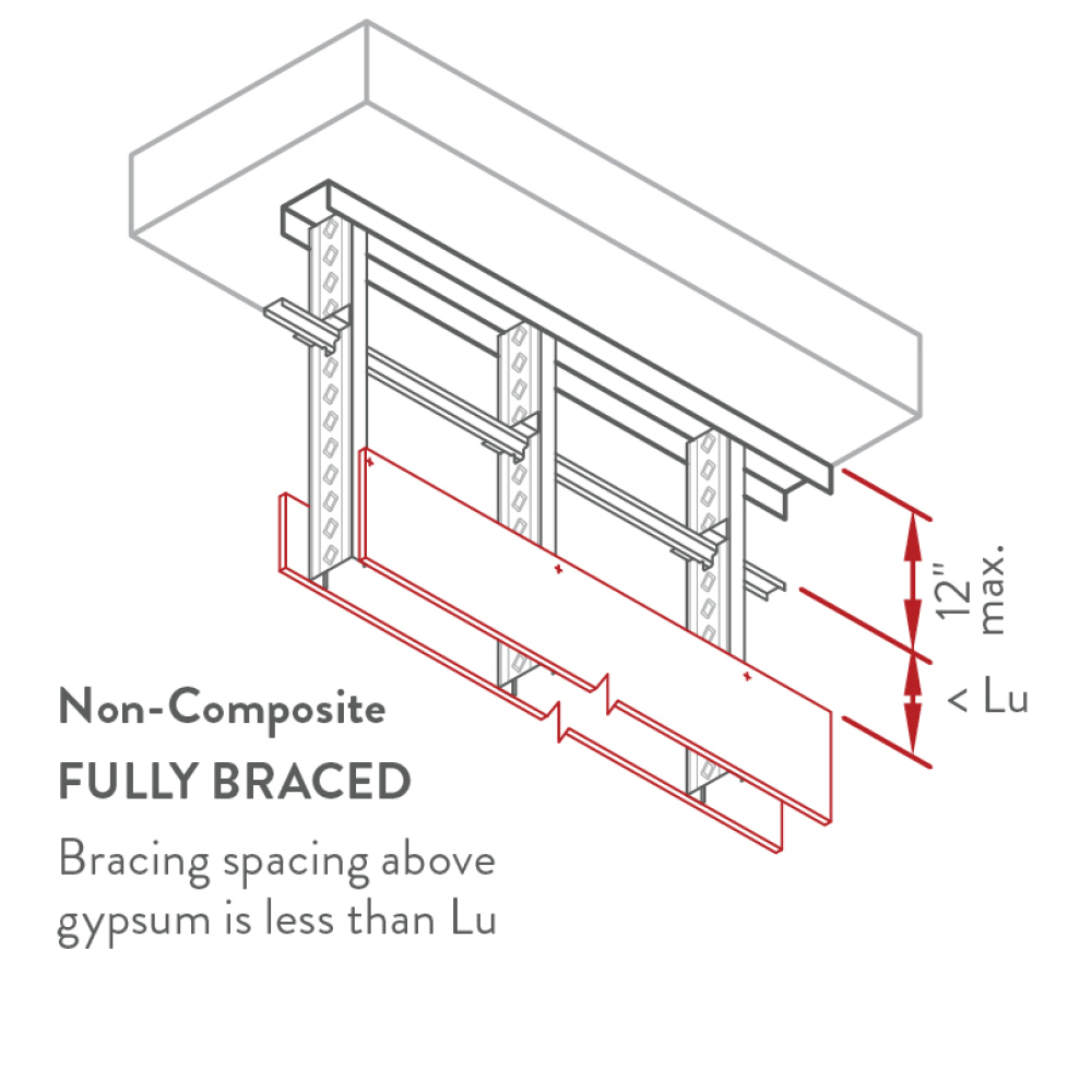 Non-composite conditions are common in all structures. When the gypsum board stops at the ceiling level, but the stud continues to the deck, it is a non-composite condition. Wall framing with Deflection Track/MaxTrak, Resilient Channel (RC) or Sound Clips is a non-composite design since the screws attaching the gypsum board are not directly attached to the framing or top track. While there may be advantages to contacting Technical Services or a Design Professional, many conditions can be covered by limiting heights tables shown below. When in doubt, call our complimentary Technical Services Hotline at 888-437-3244.