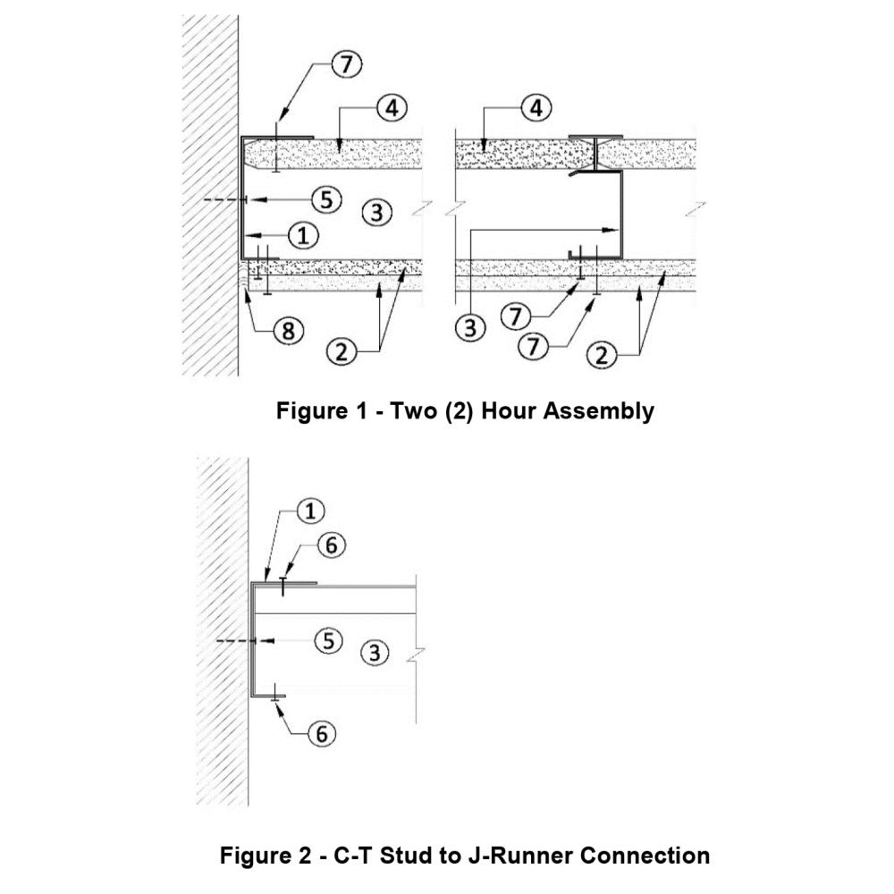 The track to perimeter wall connection (Item ⑤) shall be detailed by the designer to provide a minimum of 200 lbs of shear capacity for every C-T stud location. - 1-inch thick x 24-inches-wide gypsum shaft liner panels (Item ④) are inserted in the J-Tracks (Item ①) towards the ceiling (2-in leg of the J-Track).