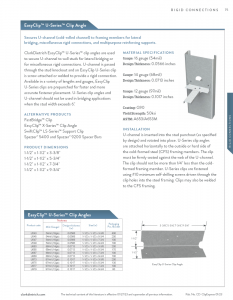 EasyClip™ U-Series™ Clip Angles are used to secure U-channel to wall studs for lateral bridging or for miscellaneous rigid connections. U-channel is passed through the stud knockout and an EasyClip™ U-Series™ clip is screw-attached or welded to provide a rigid connection. EasyClip™ U-Series™ clips are prepunched for faster and more accurate fastener placement. U-Series™ clip angles and U-channel should not be used in bridging applications when the stud width exceeds 8".