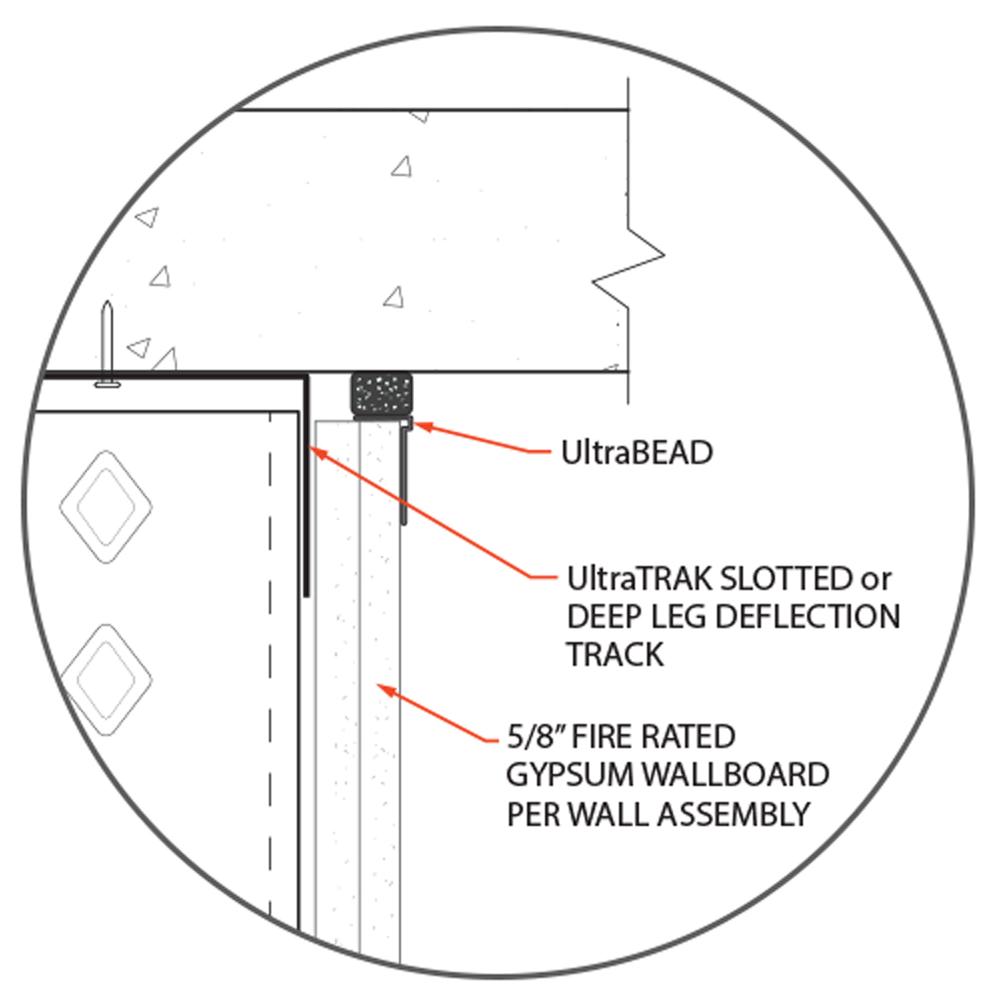 UltraBEAD, when used in conjunction with UltraTRAK slotted deflection track or Deep Leg deflection tracks, provides joint protection up to ¾” for a 1 or 2 HR concrete deck Head of Wall Joint System at 60% compression.
